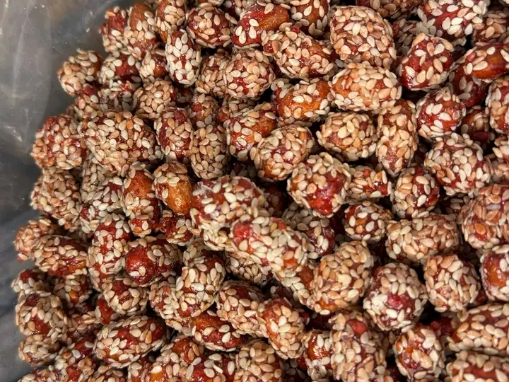 المكونات: حبات فول سوداني محمصة بالكامل، مغطاة بطبقة رقيقة ومقرمشة من السكر المكرمل (أو عسل الجلوكوز)، ومرشوش عليها كمية سخية من السمسم المحمص.